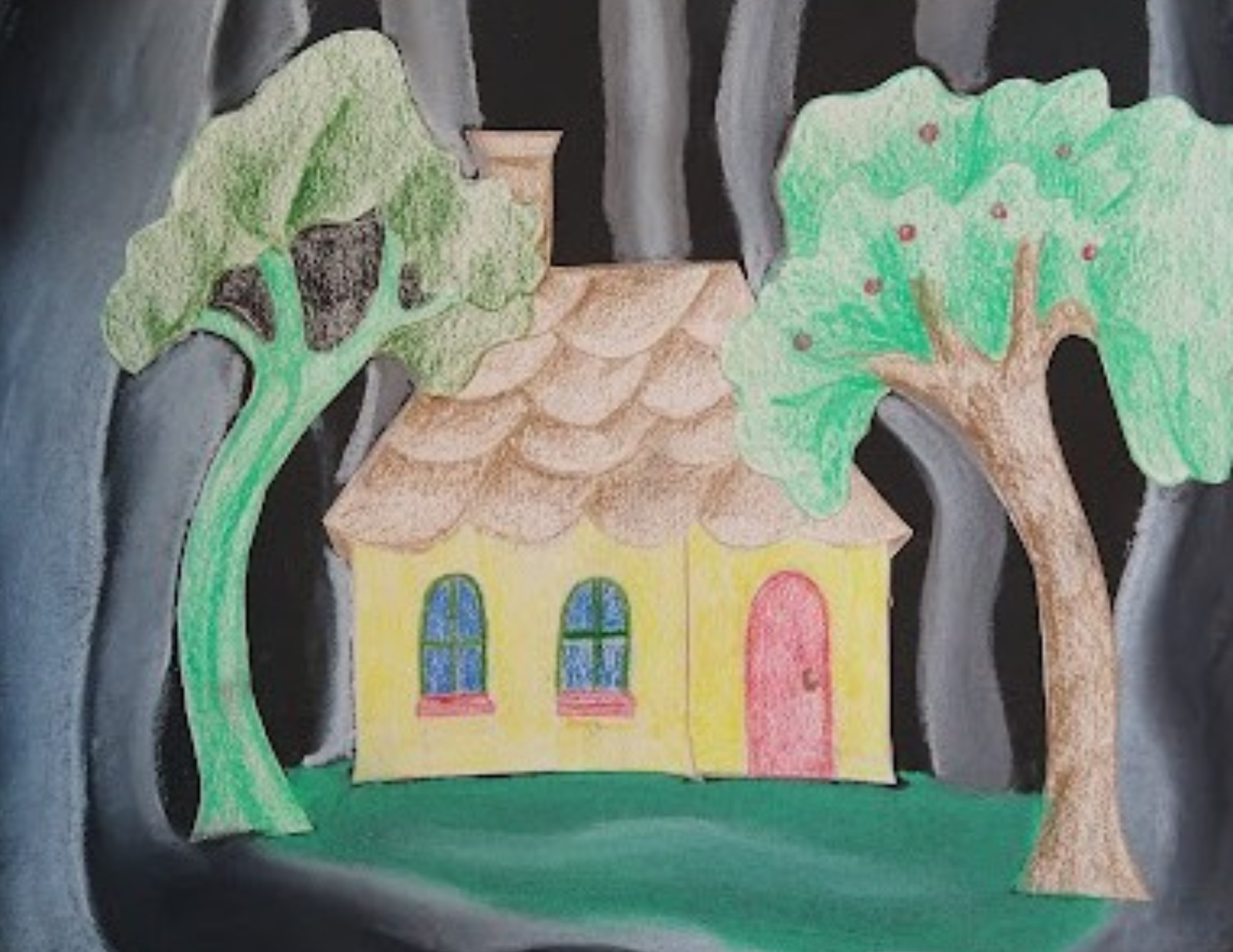 In this more advanced group, students will be encouraged to overlap tree shapes to add interest. After the house and trees are glued down, students will draw in the foreground of the forest using chalk pastels.